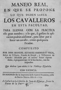 1769. (EQUITACION). ALVAREZ OSSORIO Y VEGA, MANUEL: MANEJO REAL, EN QUE SE PROPONE LO QUE DEBEN SABER LOS CAVALLEROS EN ESTA FACULTAD, PARA LLENAR CON LA PRACTICA ESTE GRAN NOMBRE, Y LO QUE GUSTARE SU APLICACIÓN, PODRÁN ADELANTAR, ... Madrid: Imp....