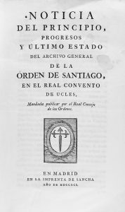 1791. (CUENCA). NOTICIA DEL PRINCIPIO, PROGRESOS Y ULTIMO ESTADO DEL ARCHIVO GENERAL DE LA ORDEN DE SANTIAGO, EN EL REAL CONVENTO DE UCLES. Madrid: Imp. de Sancha, 1791. Folio. 28 p. Marca de punzón que atraviesa la obra, con pequeña pédida de...