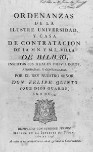 1796. (BILBAO). ORDENANZAS DE LA ILUSTRE UNIVERSIDAD Y CASA DE CONTRATACION DE LA M.N. Y M.L. VILLA DE BILBAO. Madrid: Imp. de Sancha, 1796. Folio. 2 h. + 370 p., 33 h. Papel algo tostado, puntos de óxido. Enc. en plena piel.