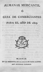 1803. ALMANAK MERCANTIL O GUIA DE COMERCIANTES PARA EL AÑO DE 1803. Madrid: Imp. de la calle de Cape Llanes, 1803. 8º menor. 7 h. + 446 p., XLIX p. Enc. en plena piel, tejuelo, lomo cuajado, cortes dorados.