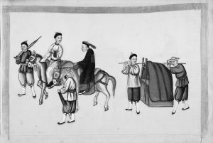1850 ca. ALBUM CON 12 ORIGINALES CHINOS SOBRE PAPEL DE ARROZ. Cada original 20x33 cm. Vivos colores. Montados en hojas de un álbum con desgastada encuadernación de seda natural. Los originales presentan una procesión votiva.