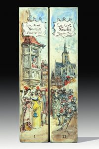 Jolie édition illustrée de plus de 300 dessins, dont 2 frontispices et 6 figures hors texte. Très séduisant exemplaire, relié en demi-vélin avec les dos ornés en long d’une charmante composition aquarellée par Robida. Il est enrichi de : - 82 petits dessins préparatoires au crayon, à l’encre et au lavis, sur un papier fin blanc ou la plupart du temps bleu. - 6 dessins aquarellés préparatoires pour l’emboîtage de l’éditeur. - 13 figures hors texte en 2 états, en noir et en couleurs. - une épreuve supplémentaire de presque toutes les illustrations. Tous ces dessins et ces épreuves sont collés sur des feuilles de papier serpente intercalées dans les volumes.