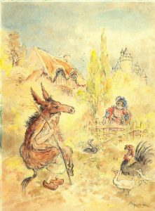 12 compositions en couleurs. Rousseurs claires sur la couverture. On joint une AQUARELLE ORIGINALE sur papier représentant Peau d’âne (environ 300 x 220 mm), signée par Robida, projet pour la couverture du livre.