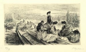 Premier tirage de cette suite de 7 planches gravées à l’eau-forte, numérotées et signées au crayon. Celles-ci sont accompagnées d’un texte imprimé sur un bi-feuillet, orné d’une vignette gravée sur bois. Une des eaux-fortes a été reprise pour illustrer le premier plat de la couverture. Sur la planche intitulée Les Fugitifs, Robida s’est représenté assis au milieu de sa famille, fuyant Compiègne en août 1914 : À la déclaration de guerre, en août 1914, [Robida] se trouve à Compiègne chez son frère. Sa belle-mère malade, il est obligé de retarder son départ pour Paris. Mais lorsqu’il peut partir les trains sont supprimés, il ne reste plus que la solution de prendre une péniche pour descendre le cours de l’Oise. Sans hésitation il embarque sa famille, mais, à peine a-t-il le pied sur le bateau, il ne pense plus qu’à dessiner (Brun, p. 58). Tirage à 125 exemplaires ; celui-ci un des 100 sur hollande, après 25 sur japon.