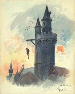 Robida. Dessin original aquarellé représentant la Tour du Louvre avec un pendu suspendu à son gibet. Dimensions : 295 x 236 mm.