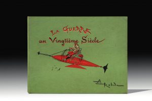 Premier tirage de l’illustration, comprenant une soixantaine de dessins et compositions en noir et en couleurs. SUPERBE CARTONNAGE DE LÉDITEUR, dont le premier plat est orné d’une composition représentant un officier pilotant un aéronef. Il est reproduit à pleine page par Brun, p. 111. Cet album forme l’un des trois volets de l’œuvre d’anticipation de Robida, avec Le Vingtième Siècle et La Vie électrique. C’est l’un des plus rares de l’artiste.