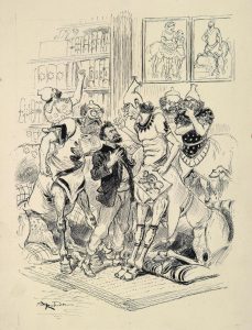 Édition originale de cette variation sur le thème des voyages deGulliver, décrivant les aventures extraordinaires du capitaine bordelais Zéphyrin Canigousse qui fit naufrage sur l’île des centaures et y fut retenu captif durant dix-sept ans. Premier tirage del’illustration, contenant 74compositions en noir et en couleurs, dont une couverture, un titre et 4 hors texte. EXEMPLAIRE UNIQUE, SUR JAPON, CONTENANT TOUS LES DESSINS ORIGINAUX À LA PLUME IL SE PRÉSENTE DANS UNE RELIURE EN VÉLIN DÉCORÉE DE 3 COMPOSITIONS ORIGINALES PEINTES PAR ROBIDA sur les plats et le dos. Les feuillets du texte et les dessins originaux sont tous montés sur onglets. Petit défaut de papier à la page 33, touchant une lettre du texte.