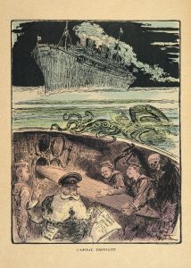Superbe et rare album dans lequel Robida décrit et représente, d’un crayon illuminé, les causes tragiques de la première guerre mondiale, incarnées par le Vautour Hohenzollern. Dans sa longue préface, Georges d’Esparbès parle de l’ouvrage comme d’un livre génial et prophétique, et annonce que l’Allemagne est condamnée à mourir, asphyxiée, aveuglée, emprisonnée, le ventre plein d’encre, les yeux crevés par ses plumitifs. 16 compositions hors texte en couleurs et 110 dessins en noir dans le texte, qui, très souvent, sont macabres et terrifiants.
