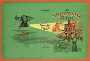 Robida. [Le Vingtième Siècle]. Couverture de percaline verte à décor polychrome réalisée par Engel et Souze pour le cartonnage du Vingtième Siècle, paru en 1883 à Paris, chez G. Decaux. Encadrée. Dimensions : 360 x 535 mm.