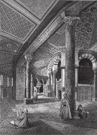 Bertrand s. d. (1862). In-plano (62 x 46,5 cm), cartonnage éditeur percaline rouge, dos à 6 nerfs orné, titre doré sur le plat. Percaline salie, mors fendillés sur la longueur du premier plat avec fente de qq. cm en tête et pied, ouvrage un peu gondolé. Titre, 4 pp. et 14 planches. Page de titre salie avec petite déchirure en marge inférieure, déchirure de 4 cm en marge d’une planche, qq. rousseurs ou traces de doigt marginales. Ouvrage illustré d’une vignette de titre coloriée et légendée (plan du Saint Sépulcre) et de 14 magnifiques planches lithographiées (12 en couleurs et 2 en deux teintes) : Halte des pèlerins à la fontaine Still Abou Nabout, Vue générale de Jérusalem, Chapelle du Saint Sépulcre, Pierre de l’Onction et dôme de la chapelle grecque, Chapelle Sainte Hélène ou de l’Invention de la Croix, Galerie conduisant à la prison du Christ, Tombeau de la Vierge, Grotte de l’Agonie, Grotte de la Nativité, Grotte au lait, Intérieur de la Porte d’Or, Mosquée d’Omar, Galerie de la Mosquée d’Omar, Mosquée El-Aksa. Provenance (note ma-nuscrite en page de titre) : Giraudeau Furcy, né en 1833 dans la com-mune d’Ars-en-Rhé et matelot de 3e classe sur l’Algesiras, commandé par le contre-amiral Jurien de la Gravière, était au nombre des Français qui en 1860, ont visité Jerusalem.