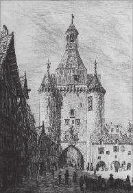 Couneau (Émile). La Rochelle Disparue. Album d’Eaux-fortes. S.l., s. n., 1911. In-plano, reliure éditeur demi-percaline rouge à coins, plats percaline verte, titre doré avec armoiries de la ville au centre du premier plat. Petites déchirures sur