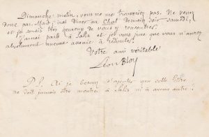 Lettre d’amitié de Bloy prenant la défense d’un jeune écrivain, mentionnant ses rencontres au Chat noir ; La femme de César ne doit pas être soupçonnée. L’amitié de Bloy non plus. Il est faux que je sois mé- content de vous et il est encore plus faux que j’aie ex- primé ce mécontentement (…). Je crois au contraire, je sais même que vous m’avez défendu et ma confiance en vous est parfaite (…). J’ai cessé depuis longtemps d’être un enfant, j’ai pris un peu d’expé- rience de la vie, je sais discerner un sentiment vrai et j’ai assez de cœur pour en être profondément touché (…). Bloy l’encourage dans « son avenir d’écrivain » et lui donne des conseils ; Ne vous troublez pas autrement des paroles de Salis. Il ya beaucoup d’enfantillage en lui (…). De plus, sa sollicitude pour moi va très volon- tiers jusqu’à une défiance universelle (…). Cependant, votre lettre m’a un peu troublé et j’ai couru au Chat noir avec une sorte d’indignation. Je voulais accabler Salis d’amers reproches sur son absurde dureté (…). Le dé- faut capital de cet homme excellent est de ne pouvoir supporter aucun blâme direct (…). Et de conclure : Règle générale : Je défends toujours mes amis et je n’écoute jamais le mal qu’on m’en dit. Cela doit vous suffire (…). Il l’invite à dîner prochainement au Chat noir et lui recommande de ne pas montrer cette lettre.