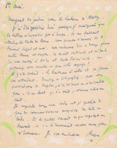 Cocteau annonce son départ pour Rome avec Francine Weisweiller et Edouard Dermit ; Muguet du jardin pour le bonheur de Mary (…) Nous resterons dix à douze jours entre Rome et Naples. Il serait ridicule et néfaste de vous savoir à Nice et Santa Sospir. Ne pourriez-vous reculer un peu votre voyage ? Il ya du soleil. Le Bateau à côté et des fleurs vous attendent (…). Nous vous préviendrons de Na- ples, si le Vésuve ne se réveille pas. Il ne dort que d’un œil, comme chacun sait. Je reprends toutes mes toiles et je profite de peu de connaissance acquise de toile en toile. Si le public savait ce que représente ce travail, il se détourne- rait encore avec plus d’horreur (…).