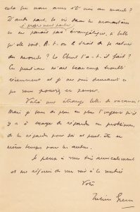 Green le remercie de sa lettre accompagnée de ce ra- vissant dessin qu’il a admiré ; il est encore à Paris et songe à repartir ; (…) J’écris un livre, je vois quelques amis et j’écoute de la musique. Toute cette vie me pa- raît tellement irréelle. Est-ce vraiment pour cela que vous avez été mis au monde ? D’autre part, la vie dans les monastères ne me parait pas à proprement parlé évangélique, si belle qu’elle soit. A-t-on le droit de se retirer du monde ? Le Christ l’a-t-il fait ? Ces questions m’ont beaucoup troublé récemment (…). Mais je sens de plus en plus l’urgence qu’il y a à essayer de résou- dre ces problèmes, de les résoudre pour soi et peut- être en même temps pour les autres (…).