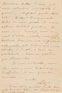 Très belle lettre de Loti avant son départ à bord du cui- rassier l’Atalante, pour la campagne du Tonkin sous les ordres de l’amiral Courbet ; Je vous écris de Brest, du « Parisien », le café légendaire des officiers de marine. Nous sommes là un groupe, tous ceux de l’ « Ata- lante » (…) appelés par notre destinée à vivre dans une promiscuité continuelle, pendant longtemps sans doute (…). On nous appelle les Tonkinois et une foule de camarades viennent nous voir parce que nous al- lons partir… J’entrevois avec une tristesse étrange, une espèce d’horreur, ce Tonkin, ce pays jaune où le sort m’envoie. J’ai le cœur affreusement serré de ce départ inattendu, de tout ce que je laisse derrière moi et que je ne retrouverai peut-être plus, amis, famille, amour (…). Loti demande de lui écrire « vite vite » avant son départ dimanche.