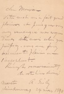 Alfred Sisley. 1839-1899. Artiste peintre. L.A.S. Moret, 24 mars 1890. 1 pp. in-12.