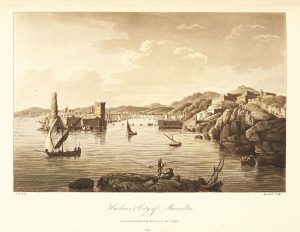 Un titre gravé, 4 cartes et un plan, 18 aquatintes représentant des vues de Conti, Nice, Monaco, Antibes... et une planche gravée. Est relié avec, du même auteur : Select views in the South of France with topographical & historical descriptions... London, s. é., 1794. Un titre gravé, 2 plans (Antibes et Toulon), 12 aquatintes et une planche gravée. Exemplaire aux armes non identifiées. Dos refait. Dimensions : 423 x 278 mm. Provenances : armes non identifiées avec devise « Pro. Christo et Patria » ; Lord Lovaine (ex-libris) ; un ex-libris non identifié avec la devise « Espérance en Dieu ». Abbey, I, 51 et 52.