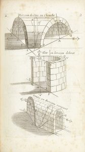 « Desargues avait déjà diffusé en 1640 un tout petit opuscule de quatre pages de texte et cinq planches ; une pour la perspective et quatre pour la coupe des pierres. Sa manière subtile et prompte d’étudier la stéréotomie, en géométrie avant tout, ne pouvait que rencontrer l’incompréhension de la plupart des praticiens de cet art mécanique. Il se heurte même à une franche hostilité de certains. » « Les ouvriers de mains travaillant souvent à l’aventure et en tâtonnant, Bosse comme Desargues sont convaincus que, pour soulager leur peine, il faut leur donner des règles sûres et expéditives fondées sur le raisonnement. A l’inverse de Desargues, Bosse pense nécessaire de transmettre ces règles au moyen d’une pédagogie adaptée au degré de leurs connaissances et procédant par étapes cognitives. De plus, Bosse, graveur en taille douce, est l’illustrateur de son propre texte (situation rare), ce qui lui permet de transmettre exquisément son savoir. » Un titre gravé et 114 planches interprétées par Bosse.