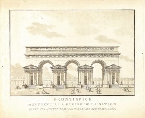 Un titre et 88 planches gravées à l’aquatinte par Janinet et J. B. Chapuis d’après les dessins de Durand, Garbizza, Toussaint et Mopillé. Ils représentent des vues du Louvre, de la Sorbonne, du Palais-Royal, des Invalides, de Versailles, de Fontainebleau... Dos passé. Manque à la coiffe supérieure. Dimensions : 251 x 329 mm. Cohen, 516.