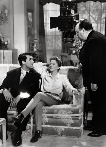 Cary Grant, Joan Fontaine et Alfred Hitchcock sur le tournage de son film (1941). Épreuve argentique d'époque sur papier cartoline (33,5x24 cm) de Gaston LONGET (1900-1981). Tampons du photographe et de la production au dos.