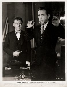 Humphrey Bogart et Peter Lorre dans le film de John Huston (1941). Épreuve argentique d'époque (25,5x20,5 cm, marges comprises). Tampon de la production au dos.