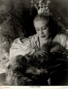 Josette Day et Jean Marais dans le film de Jean Cocteau (1946). Épreuve argentique d'époque sur papier cartoline (27x21 cm, marge comprise) de G. R. ALDO (1905-1953). Mention du photographe dans le coin inférieur droit de l'image.