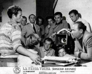 Luchino Visconti sur le tournage de son film (1948). Épreuve argentique d'époque sur papier cartoline (24x30 cm, marge comprise) de Paul RONALD (né en 1924). Mention du photographe dans la marge.
