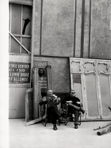 Bourvil et Jean Gabin sur le tournage du film de Claude Autant-Lara (1956). Épreuve argentique d'époque (24x18 cm, marge comprise). Tampon « Photos MATCH » au dos.