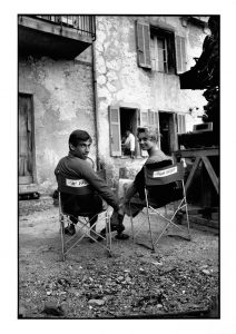 Brigitte Bardot et Roger Vadim sur le tournage de son film (1956). Épreuve argentique postérieure sur papier cartoline (40,5x30,5 cm, marges comprises) de Michou SIMON. Tampon du photographe au dos.