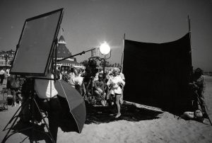 Marilyn Monroe et Tony Curtis sur le tournage du film de Billy Wilder (1959). Épreuve argentique d'époque sur papier cartoline (16x24 cm) de Dick MILLER (1912-2010). Tampons du photographe et de l'agence Globe Photos au dos.