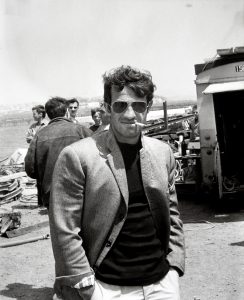 Jean-Paul Belmondo sur le tournage du film de Jean-Luc Godard (1965). Épreuve argentique postérieure sur papier cartoline (51x41 cm) de Tony GRYLLA (né en 1941), numérotée 7/30. Signature et tampon du photographe au dos.