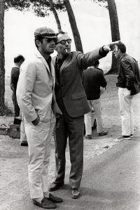 Jean-Paul Belmondo et Jean-Luc Godard sur le tournage de son film (1965). Épreuve argentique d'époque (30x20 cm). Tampon de l'agence Reporters Associés au dos.