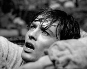 Alain Delon sur le tournage du film de Christian-Jaque (1962). Épreuve argentique d'époque sur papier cartoline (23,5x29,5 cm). Tampon de l'agence Pierluigi au dos.