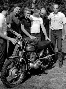 Épreuve argentique postérieure sur papier cartoline (40,5x30,5 cm, marges comprises) de Tony GRYLLA (né en 1941), numérotée 4/30. Signature et tampon du photographe au dos. Présentation de la T100SC à l'usine Triumph de Meriden, en septembre 1964.
