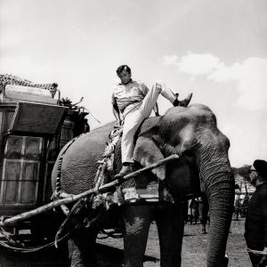 Robert Mitchum sur le tournage du film de Ronald Neame (1965). Épreuve argentique d'époque sur papier cartoline (26x25cm) de Robert PENN (1925-2002). Tampon de l'agence Camera Press Ltd. et mention du photographe au dos.