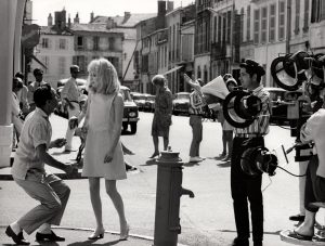 Catherine Deneuve, Gene Kelly et Jacques Demy sur le tournage de son film (1967). Deux épreuves argentiques d'époque (18x24 cm et 26,5x16,5 cm) d'Hélène JEANBRAU. Tampons de la photographe et de la production au dos.
