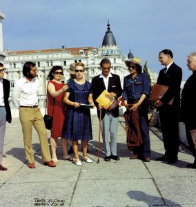 Jack Nicholson et Dennis Hopper pour son film (1969). Épreuve argentique postérieure (30,5x30,5 cm). Mention manuscrite « Photo Alfieri » dans le coin inférieur gauche de l'image et tampon du studio Photo Alfieri au dos. Présentation du film à Cannes, le 8 mai 1969.
