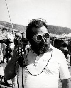 Sergio Leone sur le tournage de son film (1971). Épreuve argentique d'époque (25,5x20,5 cm) d'Angelo NOVI (1930-1997). Tampon du photographe au dos.