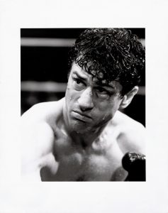 Robert De Niro dans le film de Martin Scorsese (1980). Épreuve argentique d'époque sur papier cartoline (35,5x28 cm, marges comprises) de Christine M. LOSS (née en 1944). Sticker de la photographe au dos.