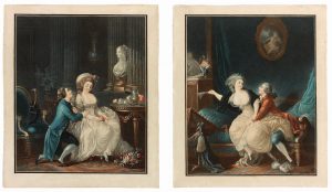 Louis - Marin Bonnet (1743 - 1793) L’ Eventail Casse - L’ Amant Ecoute Deux pendants d’après F. Schall. (Hérold 835, 836) sujet : 26,2 x 21,cm Gravure au pointillé en couleurs. Très belles et fraîches épreuves avant la lettre. Infimes