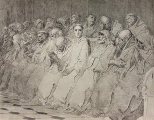 Gustave Dore (1832 - 1883) Le Neophyte (planche définitive). (Béraldi 34) 57 x 73 - 60 x 73 cm Eau - forte. Quatre épreuves en états différents avec avancement des travaux, l’une au trait seul est coupée au format : 51 x 72,5 cm, les angles