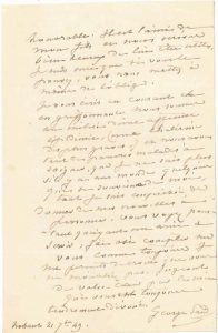 George Sand. L.A.S., Nohant 21 septembre 1849, à Édouard charton ; 3 pages in-8. Belle lettre en faveur de son ami le peintre et dessinateur léon villevieille (1826-1863). Elle ne sait si Charton s’occupe « toujours directement du Magasin