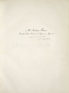 ÉDITION ORIGINALE de cet imposant ouvrage consacré à Jules César. Il est illustré de 37 planches hors texte dont un portrait de Caïus Julius Caesar gravé par Adolphe Salmon d'après Ingres et 36 simples ou doubles planches en couleurs pour les cartes, plans de bataille, planches techniques. Exemplaire aux armes de Napoléon III, portant au bas des plats la mention Donné par l'Empereur, et enrichi sur un feuillet de garde d'un envoi autographe signé de deux écritures différentes : d'une première main à Mr Anselme Petetin, / Conseiller d'Etat, Directeur de l'Imprimerie Impériale et de la main de l'Empereur souvenir d'amitié / Napoléon. Bel exemplaire malgré des frottements aux coupes et un petit gauchissement des deux volumes qui peut très certainement disparaïtre à la mise sous presse.