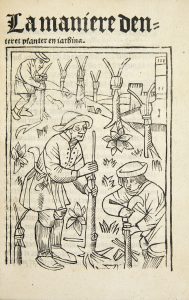 Rare réimpression faite au XIXe siècle par Pilinsky, tirée à peu d'exemplaires, d'une très rare plaquette incunable imprimée en caractères gothiques sur l'art de jardiner. Elle a été faite sur le seul exemplaire connu qui figurait à la vente Potier (1870, n°390). Un bois sur le titre représentant des paysans taillant des arbres et un bois au dernier feuillet représentant une scène de chasse. Ravissant exemplaire dans une reliure dont la qualité est telle qu'elle mériterait d'être signée. Ex-libris Guaita et Lallemand de Mont.