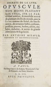 Antoine MIZAULD. Opuscule non moins plaisant que utile, sur le particulier consent, et manifeste accord de plusieurs choses du monde, avec la Lune : comme du Soleil, du sexe feminin, de certaines bestes, oyseaux, poissons, pierres. Paris, Federic...