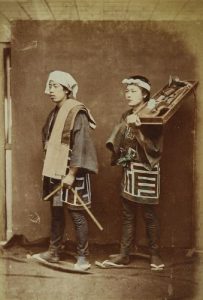 Kusakabe Kimbei et divers Japon, 1870-1880. Maraichers. Geishas. Cérémonies du thé. Porteurs d’eau et de bois. Découpe du bois. Rizières. Samouraïs. Lettrés. Album in-4 oblong, reliure en demi-maroquin et percaline verte, titré en lettres...
