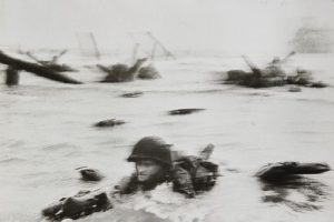 Robert Capa (1913-1954) France. Normandie, 6 juin 1944. D-Day. Troupes américaines à l’assaut d’Omaha Beach lors du débarquement. Épreuve argentique (c. 1960). Tampon “© Robert Capa” et annotations manuscrites en hébreu au verso. 20,3 x...