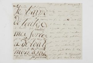 grand mot lâché je devrais bien me taire n’ayant plus rien dans mon bissac qui vaille la peine d’être exhibé. Je suis triste, ce n’est pas bien intéressant. J’ai le plus grand besoin de te voir un peu plus de cinq minutes à la fois mais tu ne le peux pas et puis tout cela est contenu dans : je t’aime. Ainsi tout ce que je dis en plus n’est que du rabâchage bête. Tu devrais donc bien permettre que j’écrive ce seul mot je t’aime dans toute l’étendue de mon papier. Ça te fatiguerait moins les yeux et tu en saurais tout autant de mon pauvre cœur.[Les 2 pages suivantes sont écrites en très gros caractères :]Mon Toto bien aimé Je t’aime de toutes mes forces et de toute mon âme Jujulina.[Dans les interlignes elle ajoute :] Au moment de mettre ma lettre en son lieu d’attente je m’apperçois que les autres ont été oubliées dédaigneusement. Pauvres lettres elles ont le même sort que leur auteur c’est quand on n’a rien de mieux à faire qu’on y pense, ce qui n’arrive pas souvent. Voilà un petit incident qui ne me rendra pas le cœur plus gaie tout le reste de la journée. Je commence à sentir que je bois. Je ne tarderai plus long-temps je l’espère à me noier ce qui sera bien heureux pour tous les deux. Amen. »