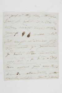 réservé la première lecture à Juliette.]« Il y avait quinze jours, mon adoré, que vous n’étiez venu déjeuner avec moi aussi Dieu sait quel appétit j’avais de vous. Je vous aurais avalé comme une cerise si vous n’aviez pas eu de queue. C’est pour le coup que la précaution du petit Toto était bonne : Ze ne sait pas si zai une queue mais ze veut pas comme la coupe. Je m’aperçois que j’ai pris mon papier à l’envers. Heureusement que mon amour est à l’endroit et que vous vous y retrouverez tout de même. J’ai une plume hideuse. J’aimerais autant écrire avec une tête de pavot j’en viendrais mieux à bout […] Je vais écrire à la mère Krafft si elle peut me prêter un vieux chapeau ça nous fera toujours une petite économie et peut-être un jour de plus de bonheur ? Quel miracle que ta pièce, mon pauvre bien-aimé, et que tu es bon de me l’avoir fait admirer la première. Jamais je n’avais rien entendu d’aussi magnifique. Je n’en excepte même pas tes autres chefs-d’œuvre. C’est une richesse, une magnificence, un éblouissement dont on ne peut pas se faire une idée avant de l’avoir entendue. C’est miraculeux. Malheureusement mon esprit en est encore plus obscurci, comme quand les yeux ont trop long-temps fixé le soleil il reste des tâches noires devant les yeux [dessin de 2 taches noires] comme cela. C’est ce qui m’arrive j’y vois moins que jamais. Je suis bête comme une oie et si ce n’était mon amour qui me tient lieu de chandelles et de lumière je n’y verrais plus du tout. Oh ! mon beau soleil vous m’avez aveuglée pour lon-temps. Je ne vois plus rien que vos rayons qui me brûlent : au dedans, au dehors de moi tout ce qui n’est pas vous est noir »...