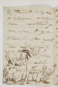 Juliette DROUET (1806-1883).Lettre autographe signée « Juliette » avec dessin, 8 septembre [1838] samedi midi 3/4, à Victor Hugo ; 4 pages in-8.Lettre avec dessin.« Mon cher petit bien-aimé vous êtes aussi bête que moi, ce qui est un...